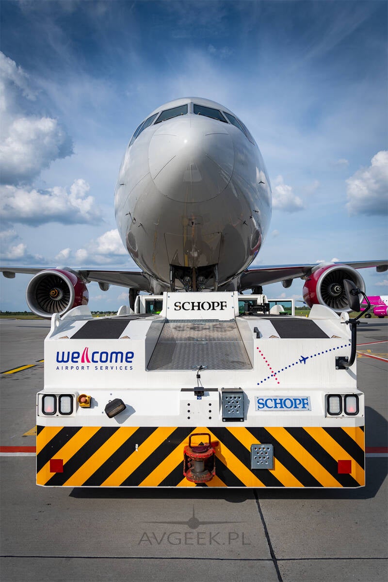 A new Airbus A-370 being towed by a Schopf F160 at Poznań-Ławica Airport which is a medium sized airport in Great Poland, Poland on December 8, 2023. Photo: AvGeek.pl.