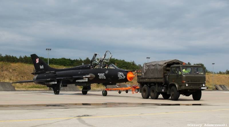 Mikoyan-Gurevich MiG-29 Fulcrum of the Polish Air Force being towed by a Polish Army FSC (Fabryka Samochodów Ciężarowych) Star truck. Photo: Mirek - Flying Objects Photographer.