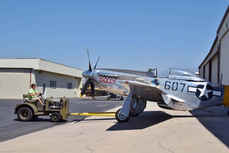 The image shows a North American P-51D Mustang “Dolly,” an iconic American long-range fighter and fighter-bomber from World War II, being towed by a Clarktor CM44 (Clark Mill 44) aircraft tractor on August 30, 2025, for an engine run-up, a final engine test for the AT-6 Texan Flying Extravaganza airshow, to be held at the Planes of Fame Air Museum in Chino, California, on September 6, 2025. “Dolly” refers to this specific North American P-51D Mustang, registration number N544IV, originally known as the "Spam Can," but later renamed "Dolly" after it was acquired by the Planes of Fame Air Museum. It is notable for its "Dolly" livery during its appearance at the Gathering of Mustangs and Legends airshow, held September 27–30, 2007, at Rickenbacker International Airport in Columbus, Ohio. The Clarktor CM44 is an aircraft tractor from the Second World War, while the Clarktor CT40 was built during the Korean War. A notable difference between the two is that the CM44 had its fuel tank under the hood with the fuel cap on top, while the CT40 had its fuel tank under the driver's seat. Photo: Craig Bryant.