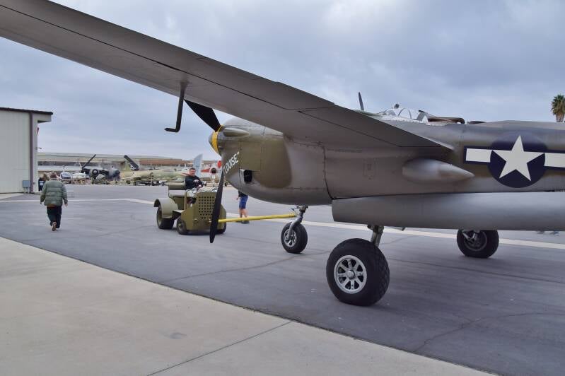A North American P-51D Mustang “Crusader” being towed by a W.F. Hebard Shop Mule aircraft tractor at Front Range Airport, Adams County, Colorado, United States on March 1, 2023. Photo: Dylan Dorvee.