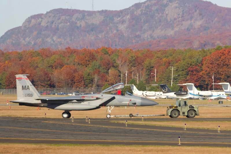A Nissan FV02 pushback tractor tows a trailer with a Pratt & Whitney F135 turbine engine of an F-35 at Williamtown Air Base of the Royal Australian Air Force on November 4, 2021. Photo: G.E.G. Aviation Photography.