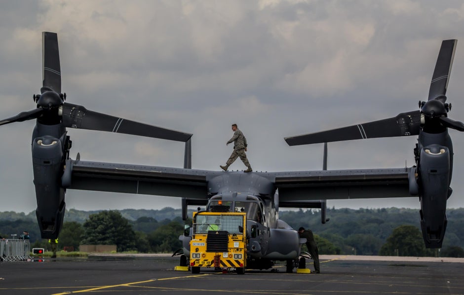 A McDonnell F/A-18C Super Hornet of the Swiss Hornet Display Team being pushed into its shelter by a DC-5 Tugmaster Douglas aircraft tug following the RAF Cosford Air Show on June 9, 2019 in England. Photo: Mike Parker.