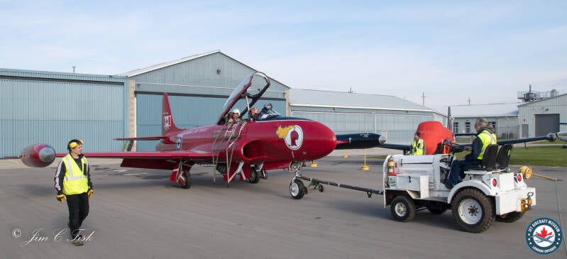 The Snowbirds, officially known as 431 Air Demonstration Squadron are the military aerobatics flight demonstration team of the Royal Canadian Air Force stationated at Moose Jaw Air Base. In the photo one of the CL-41 Tutor aircraft being towed by a Clark tld d6 tractor. Photo from Facebookpage: Snowbirds des Forces canadiennes.