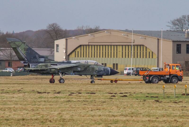 A German PA-200 Tarnado ECR being towed by a Mercedes-Benz Unimog U300 405/12AHK aircraft tractor at Fliegerhorst Schleswig-Jagel in Schleswig-Holstein in Germany on November 23, 2023. Photo: Werner Davidsen.