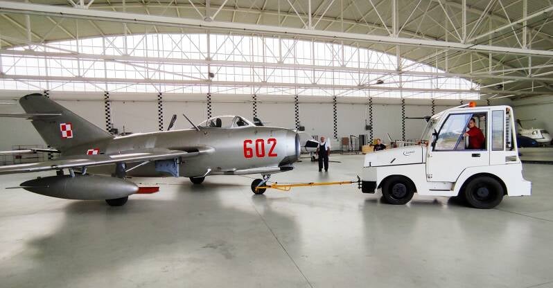 A Polish Mikoyan-Gurevitsj MiG-15 jet fighter (NATO reporting name: Fagot) with registration 602, assigned to the 1st Light Fighter Regiment of the Polish Air Force, operating at Mirosławiec Air Base. The jet fighter was built by the Mikoyan-Gurevitsj (MiG) design bureau, located in Moscow, Soviet Union/Russia. Founded in 1939, the bureau was responsible for the design of many famous Soviet jet fighters, including the MiG-15, MiG-21, and MiG-29. The MiG-15 was a jet fighter from the 1950s, famous for its use in the Korean War, and is now long retired from service with most military air forces. The MiG-15 is being towed by a Mulag Comet 6 aircraft tractor on September 12, 2021, in a hangar at Warsaw Modlin Airport, an international airport in the city of Nowy Dwór Mazowiecki, about 40 km (25 mi) north of Warsaw city center, Poland. Photo: Tomasz Filipiak.