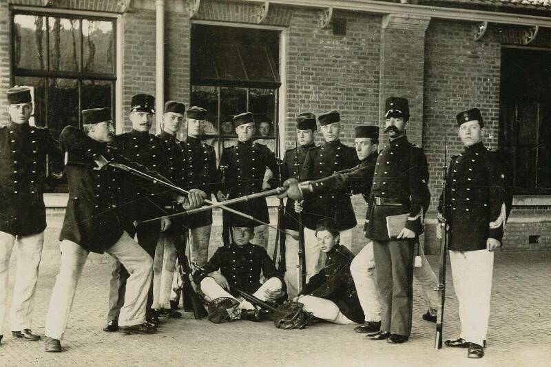 Nederlandse soldaten van de Rabenhauptkazerne aan de Hereweg Westzijde te Groningen in 1910. Ze oefenden toen met nep-bajonetten met een balletje erop. Maar de militair uiterst rechts heeft een echt wapen in de hand. Ze gebruikten oude gladloops voorlaad geweren model 1841. Deze waren in de geweerwinkel van de werkplaats wapenen te Delft omgebouwd tot een Geweer die geschikt was voor een oefening met bajonetsteken. Daarbij was in de loop een spiraalveer aangebracht waarop de stang met een leren bal rustte. Als men met een zekere kracht tegen de bal drukte schoof de stang met bal een eind naar binnen de loop in. Zo werd het gevecht met bajonet op het geweer gezet op een relatief ongevaarlijke wijze beoefend en bleef de echte bajonet gewoon in de schede aan de al dan niet gedragen koppel. Bron: Bert Koe.