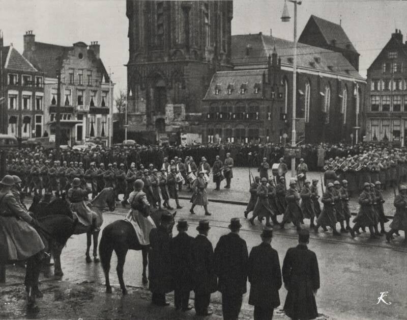 Compagnie soldaten met militair muziekkorps o.l.v sergeant en kapelmeester Jan Zuidema in 1936 hier aan de Hereweg te Groningen vlakbij de Rabenhauptkazerne. Bron: Hilbrand Zuidema.